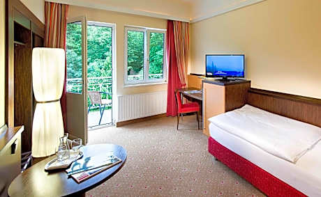 The four-star hotel in the EurothermenResort Bad Hall is the perfect place to arrive, surrounded by a 35-hectare park, the Miraverde**** offers peace and nature at its best. You can enjoy the view of the countryside from every window. Experience culinary moments of pleasure in the beautiful panorama restaurant. In addition to a breakfast buffet until 12 p.m., the luxury half-board also offers sweet delicacies in the afternoon and dinner or buffet (in the evening). As a hotel guest, you can enjoy wellness at its finest in the hotel's spacious wellness area. The diverse range of wellness and beauty treatments in the hotel's Vital & Beauty SPA creates a harmonious interplay for body, mind and soul. The wellness highlight, the Mediterrana thermal baths and Relaxium sauna world, is only a five-minute walk through the park and offers the finest bubbling and tingling attractions. As a hotel guest, you can use the thermal baths all day, including on the day of arrival and departure. The beautiful, partly natural, park is ideal for long walks, Nordic walking laps and much more.