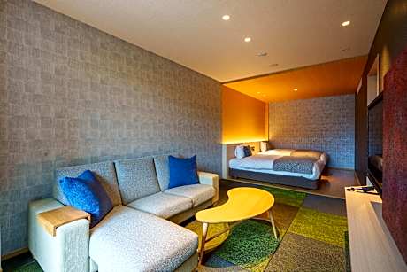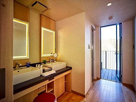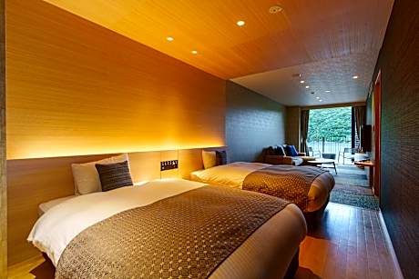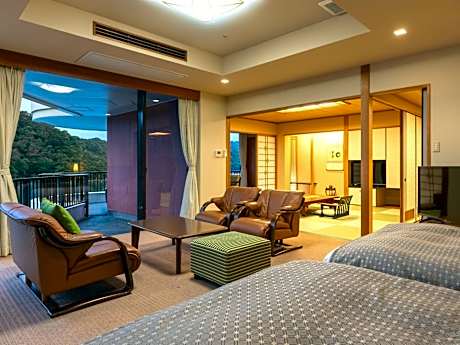 This quadruple room's special feature is the private open-air bath. The quadruple room offers air conditioning, tatami, a terrace with sea views as well as a private bathroom featuring a bath. The unit offers 2 beds and 2 futons.