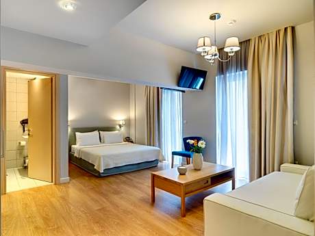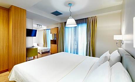 Located on the upper floors, either with a balcony or furnished terrace, this suite is fitted with top standard materials in contemporary colors. It consists of 2 rooms and features COCO-MAT beds and mattresses for top-sleeping quality, COCO-MAT wooden furniture, a convertible sofa, wooden floor, modern ergonomic bathroom with thermostatic rain shower, and shower cabin or bath. There is also smart internet-TV, mini-bar, tea/coffee maker and a laptop-size safe.