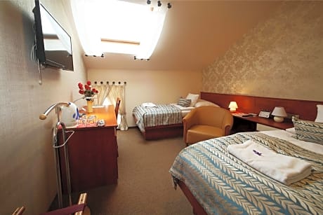 This room includes a private bathroom and a seating area with satellite TV. It comes with a refrigerator, a mini-bar and an electric kettle.