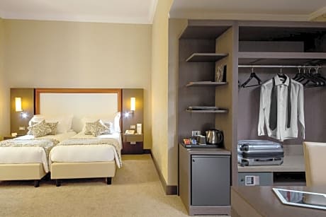 Large room with air conditioning, a satellite LCD TV, a free mini-bar and a private bathroom with hairdryer and luxury toiletries.