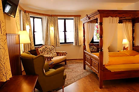 This spacious and traditionally furnished room features a four-poster bed, a seating area and an 83-cm flat-screen TV set.