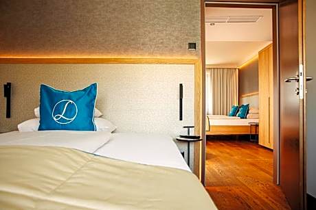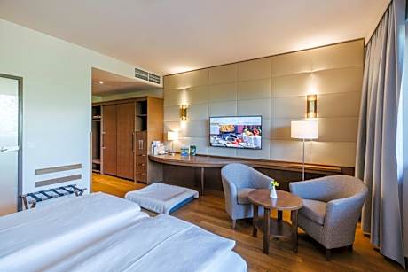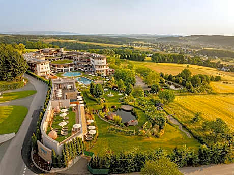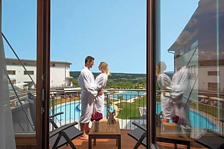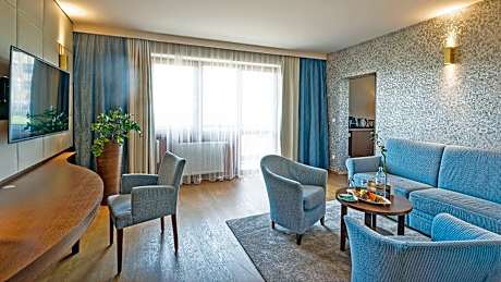 Featuring a 23 ft² wellness and spa area with a panorama relaxation area and an in-house thermal spa, the 4-star superior Hotel & Spa Larimar is located in Stegersbach in Southern Burgenland. Access to the Larimar Thermal Spa with 9 pools, 9 saunas and 9 relaxation areas (incl. Ladies Spa), is included in all rates. The modern rooms with a panoramic view and on the west side offer restful and healthy sleep. They are elegantly furnished and come with a balcony or terrace. A bathrobe, a bath towel and slippers are provided in every room. Guests are welcomed with a glass of sparkling wine. The spa area of the Larimar offers water in 3 different qualities, from thermal water to sea water and fresh water. There are 9 different saunas, an infrared-salt grotto with himalaya salt stones, a salt steam bath, an infrared sauna, a luxurious panorama relaxation room, a tea and fruit bar, and a modern fitness center. A daily wellness and activity program is included, and bicycles, Nordic walking sticks and Smovey rings are provided free of charge. Children from 16 years of age and older can access the sauna area (nude area). Guests can enjoy healthy gourmet cuisine at Hotel Larimar. Full board includes a healthy breakfast buffet with many organic products, a lunch snack with soups and salads, raw fruit, pastries in the afternoon, and a 6-course dinner. Regional and seasonal products are used for most dishes. The Larimar Bar offers cocktails and various other drinks. Every Thursday, an exquisite gourmet evening is organized, while on Thursdays and Saturdays live music is offered. Golfschaukel Stegersbach Lafnitztal is next to the hotel. It features 45-holes on 3 different courses. Guests receive a room for storage of golf equipment, cleaning facilities for golf clubs and golf shoes and golf carts (rental prices on request).