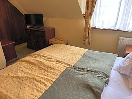 A classically furnished room with a private bathroom with a shower. Some rooms have larger beds.