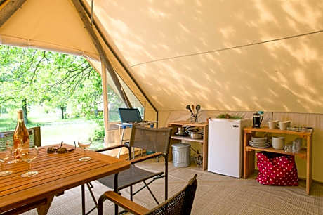 The kitchen is fitted with a stovetop, a refrigerator and kitchenware. This tent features a seating area, a terrace, garden views and a shared bathroom. The unit offers 4 beds.