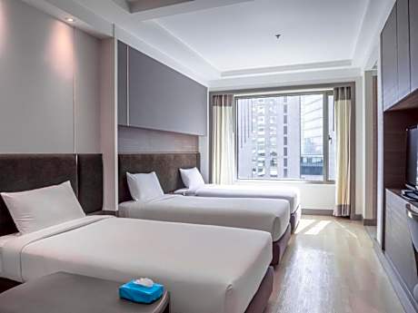 Great care is taken to ensure guests experience comfort through top-notch services and amenities. Remain linked during your visit by utilizing the complimentary internet access available.Prior to your check-in date, you can arrange airport transportation services, guaranteeing a seamless and efficient experience for both arrival and departure.Services offered by taxi and car hire at the hotel ensure effortless exploration of Bangkok.The hotel offers complimentary parking for guests who arrive with their own mode of transport. Effortlessly plan your daily activities and travel requirements with concierge service, luggage storage and safety deposit boxes provided by the front desk services.For extended visits or whenever required, the laundromat, dry cleaning service and laundry service ensures your preferred travel garments remain clean and accessible.During leisurely days and evenings, in-room amenities such as room service and daily housekeeping enable you to maximize your stay in the room. For minor or impromptu requirements, the convenience stores can promptly cater to them without the necessity of stepping out from the hotel.In limited designated zones, smoking is exclusively permitted. Crafted for coziness, every guestroom provides an array of features, guaranteeing a tranquil night's sleep while maintaining the level of comfort.For a more enjoyable stay, select rooms at hotel are equipped with blackout curtains and air conditioning.For certain chosen rooms, guests can enjoy in-room amusement like television and cable TV as a part of their stay. Rest assured that your hydration needs will be met, as some guestrooms are equipped with a refrigerator, bottled water, a coffee or tea maker, instant coffee, instant tea and mini bar. Jasmine City Hotel Bangkok offers a hair dryer, toiletries and bathrobes in the restrooms of specific accommodations. Each morning at Jasmine City Hotel Bangkok, a scrumptious, homemade breakfast kick-starts the day. Begin your holiday mornings right with your essential cup of coffee, offered daily at the cafe on-site. During your visit, indulge in a range of delightful culinary choices at hotel to enhance your experience. Experience unparalleled comfort as groceries can be brought right to your room at Jasmine City Hotel Bangkok through their distinctive delivery assistance.Indulge in the numerous pursuits available at Jasmine City Hotel Bangkok.Treat and spoil yourself by stopping at salon and sauna for a memorable experience. Begin your holiday perfectly by taking a plunge into the swimming pool. At the hotel, enjoy a laid-back beverage experience by the poolside bar, sipping on a soothing cocktail. Eliminate those holiday calories by stopping by hotel and making use of their well-equipped exercise amenities.
