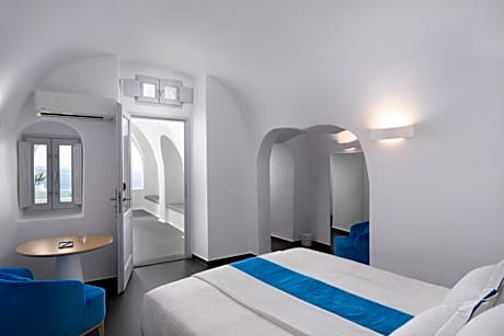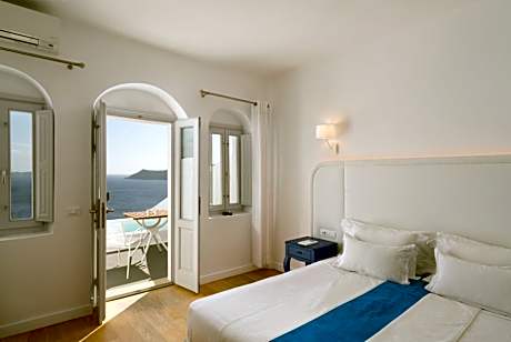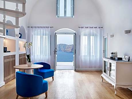 This spacious, stylishly furnished suite includes a luxurious bathroom with spa bath. It opens out to a large private terrace boasting panoramic sea and caldera views. A complimentary bottle of white wine is offered upon arrival, while guests enjoy personalized concierge service.