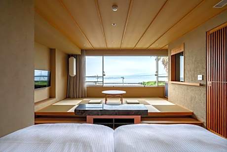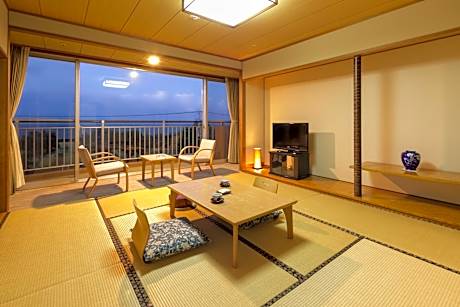 The quadruple room has tatami floors and offers a wardrobe, yukata and sea views. The unit has 4 futons.