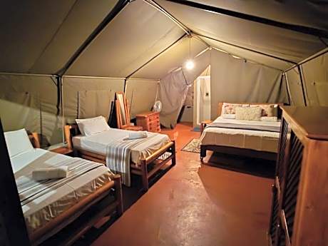 The tent's kitchenette is available for cooking and storing food. The tent offers a barbecue and a patio.