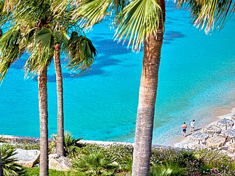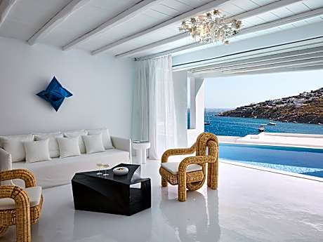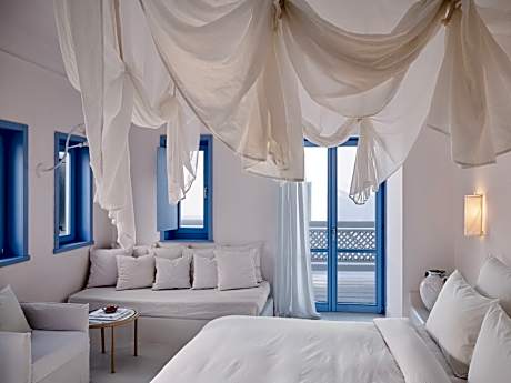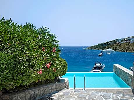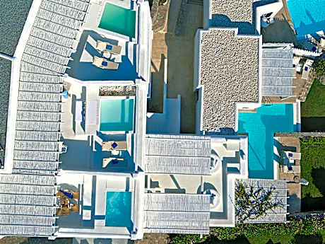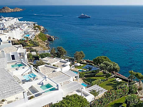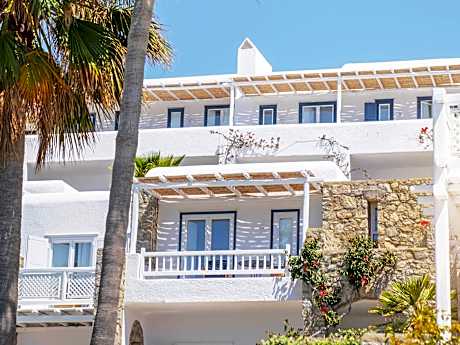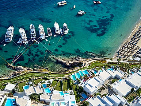 This luxury club resort, featuring fantastic villas and bungalows furnished in Cycladic-style, is superbly located in the area of Vrissi and provides views over the local sandy beach. The town of Mykonos is 5. 6 km from the beach hotel and guests can visit some of the nearby islands which include Tinos (16 km), Delos, Naxos and Santorini.