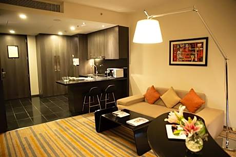 Studio Apartments are equipped with a study, kitchenette, microwave & a 3 - seater dining. Guests can enjoy buffet breakfast, premium WIFI, 15% discount on food & soft beverage. It is pet friendly.