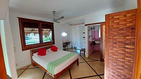 This room offers wooden furniture, mosquito net, living area and a terrace. The bathroom is private.