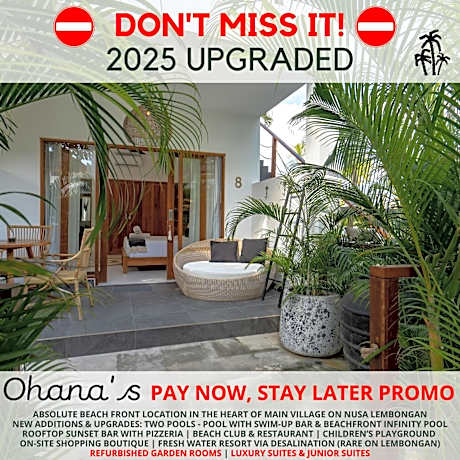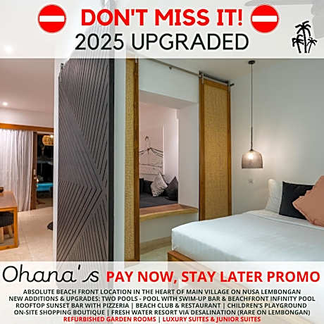 Ohana's Beachfront Resort & Beach Club features beachfront accommodations with free WiFi in Nusa Lembongan. 1.6 mi from Mangrove Point, the property provides a private beach area. Mushroom Bay is 2.6 mi from the property. The rooms at the resort are equipped with a seating area and a flat-screen TV. The rooms come with a private bathroom with free toiletries and a hair dryer. Guest rooms will provide guests with a desk and a kettle. Ohana's Boutique Resort offers an outdoor pool.