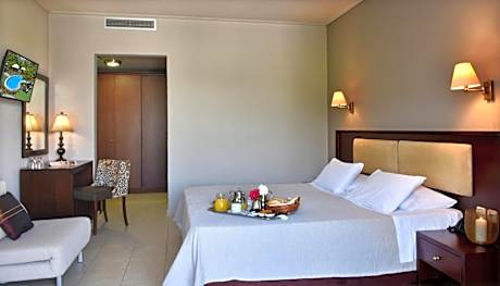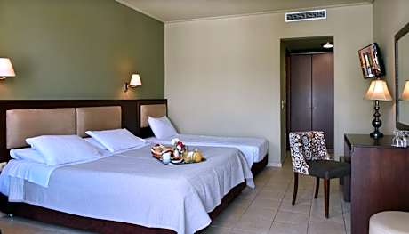 3 single beds, yard with mountain and / or pool view. One child can be accommodated in an extra bed. Please see hotel policy. Please note that a child can be accommodated at the sofa bed (please see hotel policies).