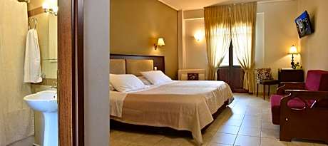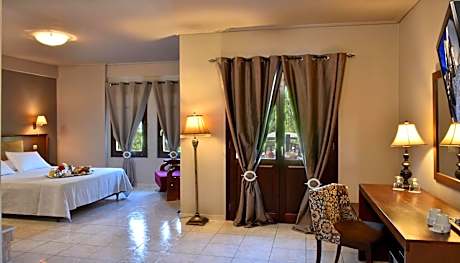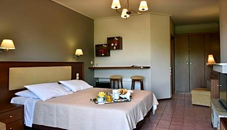 The 4-star hotel is located at an altitude of 2297 feet in the traditional settlement of Portaria, offering stunning views of Mount Pelion and Makrinitsa. It offers an outdoor swimming pool. The rooms and suites, all with independent entrance through the gardens dispose luxury and space. All units are fully equipped with mini-bar, CD player and satellite TV. Constructed with respect to the traditional local architecture and with accordance to its natural surroundings, Pelion Resort offers a complex of buildings surrounded by beautiful trees and vegetation. There are also 3 private parking areas on site. The reception, bar and restaurant, as well as the comfortable seating areas with fireplace are housed in the 2 main buildings. A spa with hot tub and sauna are also featured. Among the green gardens, the children’s playground awaits young guests who wish to be entertained. At Hotel Pelion Resort, Greek breakfast buffet is served daily by the fireplace or in the garden. It includes local yogurt, fresh fruits and fresh cheese bread as well as olive breads. License Number(s): 1021502