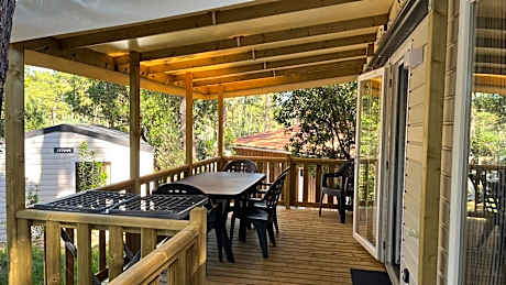 This air-conditioned mobile home consists of 1 living room, 2 separate bedrooms and 1 bathroom with a shower. Meals can be prepared in the well-fitted kitchen, which comes with a stovetop, a refrigerator, kitchenware and an oven. Featuring a terrace, this mobile home also provides a tea and coffee maker, a dining area and a flat-screen TV. The unit offers 3 beds.