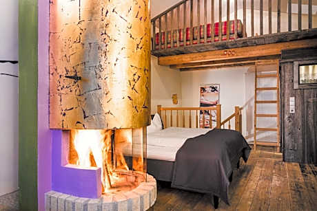 Spacious room with an open fireplace and a bathroom with a bathtub and a double washbasin. Some have a balcony overlooking the mountains.
