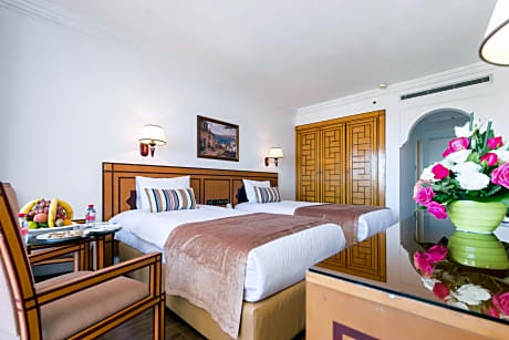 Located in the heart of Agadir, Hotel Royal Mirage Agadir offers a luxurious and comfortable stay for both leisure and business travelers. With its prime location, the hotel provides easy access to the city's beautiful beaches, vibrant markets, and bustling nightlife. The hotel is known for its exceptional service, elegant accommodations, and a wide range of amenities designed to ensure a memorable stay. Elegant Accommodations: The hotel features well-appointed rooms and suites with modern decor, offering stunning views of the Atlantic Ocean or the city. Each room is equipped with air conditioning, a flat-screen TV, mini-bar, and free Wi-Fi. Dining Options: Guests can enjoy a variety of dining experiences at the hotel's restaurants and bars, which offer a selection of international and Moroccan cuisines. The hotel also features a bar and a lounge for relaxing and socializing. Recreational Facilities: The hotel features an outdoor swimming pool. Event Spaces: With versatile meeting and event spaces, the hotel is an ideal venue for conferences, weddings, and social gatherings. The professional event planning team ensures that every event is a success. Exceptional Service: The dedicated staff at Hotel Royal Mirage Agadir is committed to providing personalized service and attention to detail, ensuring that guests have a comfortable and enjoyable stay. Highlights: Prime Location: Located close to Agadir's main attractions, including the beach, Marina, and Agadir Oufella Ruins, the hotel offers easy access to explore the city's rich culture and history. Family-Friendly: The hotel provides amenities and services catering to families Renovation Update: The hotel is currently undergoing renovations to enhance its facilities and provide an even better guest , all public area are operational . SPA CENTER , FITNESS CLUB , KIDS CLUB ARE CLOSED FOR RENNOVATON . Hotel Royal Mirage Agadir is dedicated to offering a blend of comfort, luxury, and exceptional service, making it a preferred choice for travelers visiting Agadir. Whether you are here for a relaxing beach vacation or a business trip, the hotel provides an ideal setting to experience the best of Agadir.