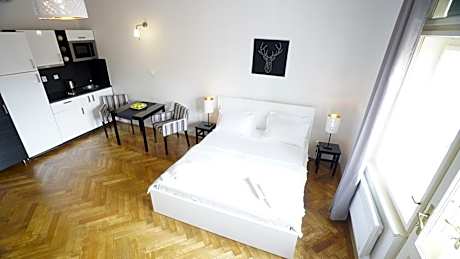 Ubicado en un edificio histórico, el Royal Road Residence ofrece apartamentos modernos con wifi gratis y cocina. Se encuentra a menos de 5 minutos a pie de la estación de metro Staroměstská. Con una decoración minimalista, cada apartamento cuenta con TV vía satélite y set de té y café. Algunos ofrecen vistas panorámicas a la Plaza de la Ciudad Vieja, aire acondicionado y balcón. Todos los apartamentos disponen de una pequeña cocina equipada con fogones, utensilios y espacio para guardar la compra. El centro comercial Palladium está a 15 minutos a pie del Royal Road Residence.