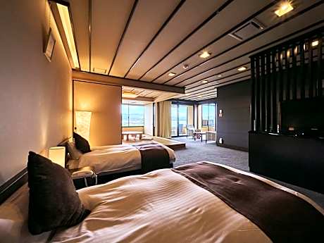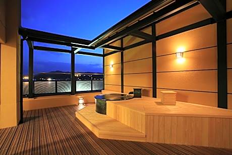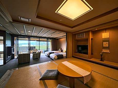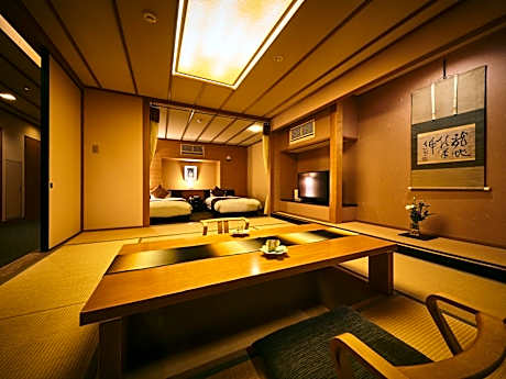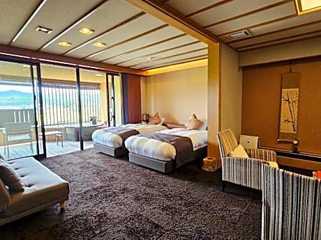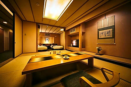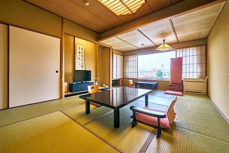 This quadruple room's special feature is the private open-air bath. The spacious quadruple room provides air conditioning, tatami, a balcony with river views as well as a private bathroom featuring a bath. The unit offers 2 beds and 2 futons.