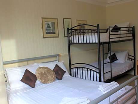 This en suite family room has a double bed and a single bed. The en suite includes a shower, hand basin, toilet and heated towel rail. This room has a sea view.