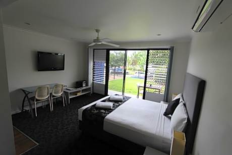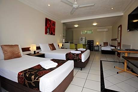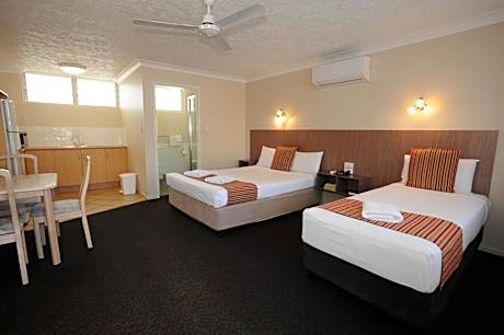 This room includes a Queen-size bed and a single bed. There is a kitchenette with large fridge, dining area, TV, air-conditioning and ceiling fans.