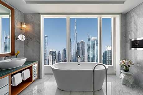 Great care is taken to ensure guests experience comfort through top-notch services and amenities. Remain linked during your visit by utilizing the complimentary internet access available. Prior to your check-in date, you can arrange airport transportation services, guaranteeing a seamless and efficient experience for both arrival and departure.Services offered by taxi, car hire and shuttle at the hotel ensure effortless exploration of Dubai.The hotel offers complimentary parking for guests who arrive with their own mode of transport. Effortlessly plan your daily activities and travel requirements with concierge service, express check-in or check-out, luggage storage and safety deposit boxes provided by the front desk services. Securing passes to the city's top attractions is simple with the hotel's ticket service and tours. For extended visits or whenever required, the dry cleaning service and laundry service ensures your preferred travel garments remain clean and accessible.During leisurely days and evenings, in-room amenities such as 24-hour room service, room service and daily housekeeping enable you to maximize your stay in the room.For minor or impromptu requirements, the convenience stores can promptly cater to them without the necessity of stepping out from the hotel.In limited designated zones, smoking is exclusively permitted.Crafted for coziness, every guestroom provides an array of features, guaranteeing a tranquil night's sleep while maintaining the level of comfort.For a more enjoyable stay, select rooms at hotel are equipped with linen service and blackout curtains. At Taj Dubai, Dubai, guests can choose from a variety of room configurations, some of which feature separate living room and balcony or terrace.For certain chosen rooms, guests can enjoy in-room amusement like daily newspaper, television and cable TV as a part of their stay.Rest assured that your hydration needs will be met, as some guestrooms are equipped with a coffee or tea maker, bottled water, instant coffee, instant tea and mini bar. Maintain your cleanliness and comfort using a hair dryer, toiletries and bathrobes available in select guest restrooms. Chosen accommodation prices might include entry to the executive lounge, offering premium services amid an ambiance of refined extravagance. Each morning at Taj Dubai, Dubai, a scrumptious, homemade breakfast kick-starts the day. Begin your holiday mornings right with your essential cup of coffee, offered daily at the cafe on-site. During your visit, indulge in a range of delightful culinary choices at hotel to enhance your experience. Concerned about your dining preferences? Fret not! Taj Dubai, Dubai offers an array of culinary choices, featuring kosher and halal alternatives. Enjoy an entertaining evening alongside your fellow travelers at hotel's very own bar and nightclub.Experience unparalleled comfort as groceries can be brought right to your room at Taj Dubai, Dubai through their distinctive delivery assistance. Indulge in the numerous pursuits available at Taj Dubai, Dubai.Treat and spoil yourself by stopping at massage, salon, steam room, spa and sauna for a memorable experience.Begin your holiday perfectly by taking a plunge into the swimming pool.At the hotel, enjoy a laid-back beverage experience by the poolside bar, sipping on a soothing cocktail. Eliminate those holiday calories by stopping by hotel and making use of their well-equipped exercise amenities.