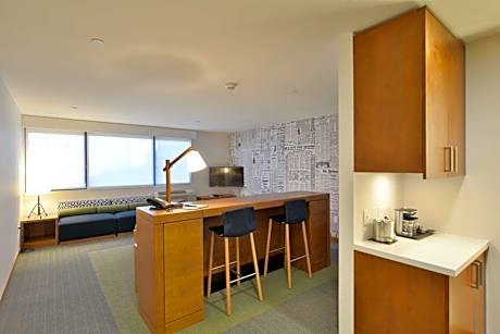 This room includes a 42-inch flat-screen HDTV, refrigerator and coffee maker.