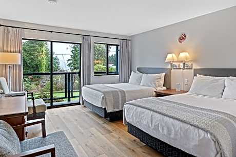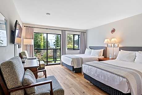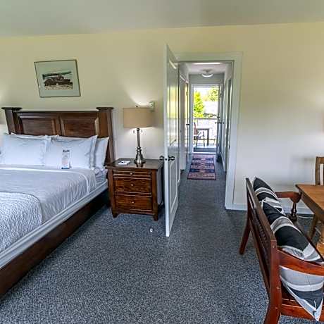 Kitchenette Suite with Balcony and Ocean View – This spacious family suite has a queen bed in the main area and a separate bedroom with two single beds. The fully stocked kitchenette provides a mini fridge, microwave, toaster oven, 2-burner stove top, coffee maker and electric kettle. Two optic TVs are located in the main area and bedroom as well as free Wi-Fi. The balcony overlooks the harbor and inlet beyond. Natural bath amenities are available in the bathroom with a shower and a bathtub. !!! NOT Pet-friendly !!!