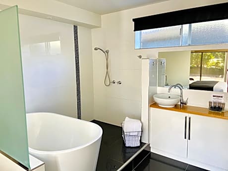 The Deluxe King Suite features 1 extra large double bed and an open style private bathroom with a deep, free standing bath.