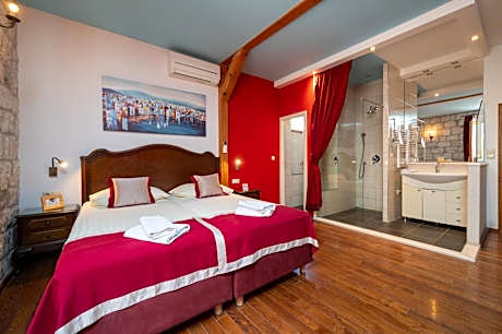 Heritage Hotel Tragos features free bikes, shared lounge, a terrace and restaurant in Trogir. This 4-star hotel offers a bar. The property provides a 24-hour front desk, airport transportation, room service and free WiFi. All guest rooms at the hotel come with air conditioning, a seating area, a flat-screen TV with satellite channels, a safety deposit box and a private bathroom with a shower, free toiletries and a hairdryer. Heritage Hotel Tragos has some units with city views, and every room includes a patio. The rooms feature a desk. A continental, Full English/Irish or Italian breakfast is served at the property. The area is popular for cycling, and car rental is available at the accommodation. Public Beach is a 12-minute walk from Heritage Hotel Tragos, while Salona Archeological Park is 15 miles away. Split Airport is 1.9 miles from the property.