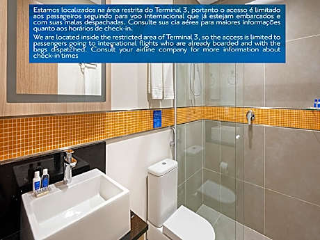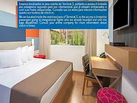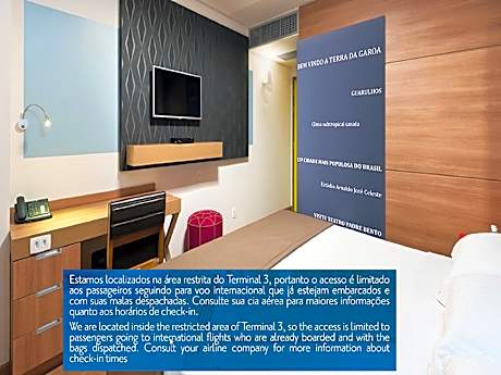 TRYP Sao Paulo Guarulhos está ubicado dentro de la Terminal Internacional 3 del Aeropuerto de Sao Paulo Guarulhos, que solo está disponible para quienes viajan a destinos internacionales. El equipaje debe registrarse con la tarjeta de embarque internacional para poder hospedarse en el hotel. Incluye una zona exclusiva para fumadores del Aeropuerto de Sao Paulo Guarulhos, un espacio público ultramoderno y tranquilo, perfecto para reuniones improvisadas y reuniones planificadas, un bar urbano en el vestíbulo y Wi-Fi gratis. Instalaciones bien diseñadas con un servicio profesional Nuestro hotel TRYP by Wyndham Sao Paulo Guarulhos Airport ofrece más Cada una de nuestras 80 espaciosas habitaciones incluye un escritorio y una silla ergonómicos, un televisor de pantalla plana de 32 pulgadas y un secador de pelo. También hay disponibles suites familiares con literas y habitaciones totalmente accesibles. El corazón y el alma financiera de Brasil - Sao Paulo - rebosa de una abundante diversidad cultural, aventuras sin igual, gastronomía y jolgorio incomparables, y tiendas, museos, entretenimiento y estimulación sensorial acordes con su condición de tercera metrópolis más grande del mundo. La ubicación de nuestro hotel dentro de los confines del Aeropuerto de Sao Paulo Guarulhos le permite ser dueño de la ciudad y sumergirse en las abundantes vistas y sonidos de nuestra metrópolis, así que cuando la aventura lo llame y el tiempo lo permita, lo invitamos a explorar los innumerables placeres de Sao Paulo y atesorar muchas experiencias brasileñas auténticas. Deléitese con la exquisita cocina brasileña, aderezada con los favoritos internacionales en nuestro restaurante, ubicado en el hotel del Aeropuerto de Sao Paulo Guarulhos. Abierto todos los días, disfrute de todas las comidas, incluido nuestro desayuno buffet. Para reuniones informales, el área del lobby de nuestro hotel del Aeropuerto de Sao Paulo Guarulhos ofrece un gran espacio para pequeños eventos espontáneos.