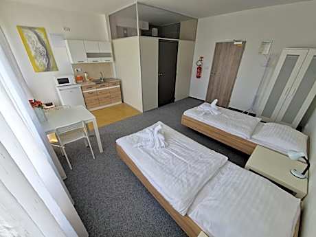 The triple room features a wardrobe and heating, as well as a shared bathroom boasting a shower. Rooms on the upper floors are reachable by elevator. The unit has 3 beds.