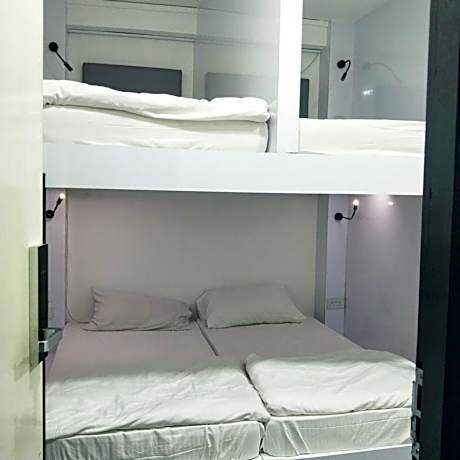 Personal pod bed with a personal locker for personal belongings and enough bed-space to sit up and read.