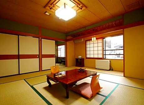 Room with a tatami (woven-straw) floor, a low table with seating cushions and traditional futon bedding. It's fitted with an LCD TV, a fridge and an attached toilet. Yukata robes are provided, while bathing facilities are shared.