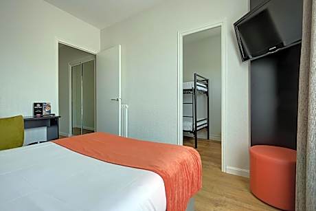 Quiet rooms located at the back of the hotel. They feature a large bed and a connecting room with bunk beds, and free Wi-Fi access. A flat-screen TV is provided.