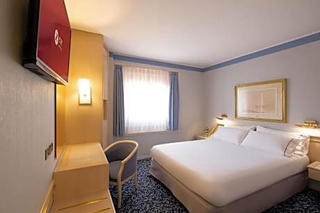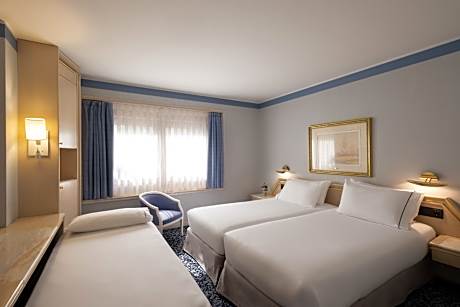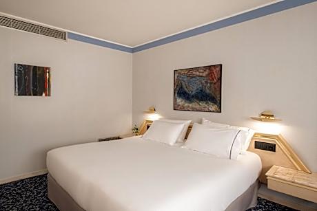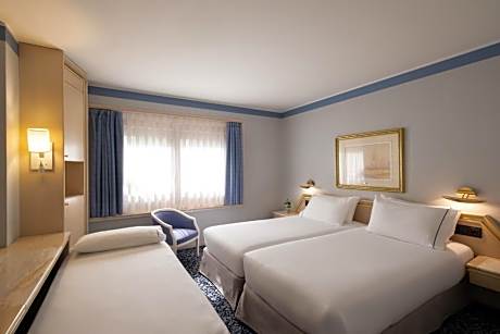 These spacious rooms feature an elegant décor with a warm color palette and modern furnishings. They feature a large double bed or 2 single beds. The private bathroom with bath tub includes toiletries and a hairdryer.