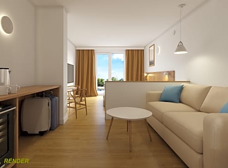 JUNIOR SUITE POOL VIEW 3 ADULTS +1 CHILD includes 2 single beds 80-130 width plus a sofa bed plus balcony, hairdryer, and tea and coffee making facilities .