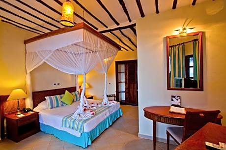 Located on the beachfront with views of the Indian Ocean, Sultan Sands offers traditional-style African huts with a balcony or terrace. It includes a buffet restaurant and bar overlooking the pool with terrace and sun loungers. Each air-conditioned accommodations is decorated with Zanzibar furniture. There is a seating area with flat-screen satellite TV, mini-bar and private bathroom. Some huts are located at the ocean’s edge. Sultan Sands Island Resort & Spa offers 2 restaurants where guests can dine at the beach or by the pool. There is a daily buffet breakfast or an option to enjoy breakfast in your room. Guests can relax with a massage in the spa center or for the more active, go snorkeling, windsurfing or play tennis. Bicycle rental and car hire is available from the tour desk. The historic old center of Stone Town is located 24 mi away. Zanzibar International Airport is a 45-minute drive from Sultan.