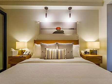 Located on the lower level, this suite has a private patio, a separate living area, and a sleeping area with a queen bed. It features a kitchenette equipped with a coffee maker, a small refrigerator and kitchenware. This unit also has individual climate control and two 43-inch flat-screen cable TVs. The bathroom has a rainfall shower.
