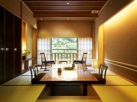 Tranquil Japanese-style rooms feature river views, a tatami (woven-straw) floor and a seating area at the floor-to-ceiling window. Amenities include a flat-screen TV, a mini-bar and an attached toilet. Guests sleep on traditional futon mats. Bathing facilities are shared.