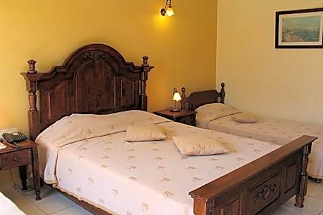 Classically furnished room with warm, earthy tones. A TV with satellite channels and air conditioning is included.