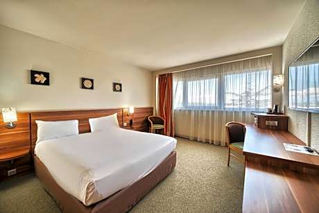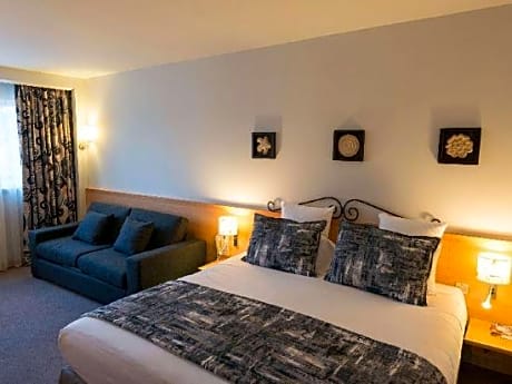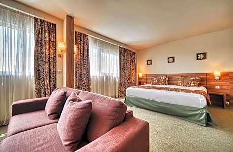 Kyriad Prestige Mulhouse - Basel is located in Sausheim, 3.1 mi from Mulhouse and guests have free access to the outdoor swimming pool, fitness center, sauna. A playground for children . Free WiFi and private parking are available at the hotel. All rooms include air conditioning and a flat-screen TV with satellite channels. Some rooms have a view of the mountains or pool. Facilities for making tea and coffee are provided in all rooms. Each bathroom includes a hairdryer, while some also have bathrobes. A buffet breakfast is available every morning in the restaurant. The restaurant serves Alsatian and fusion dishes. A lounge bar is also available at the property. The center of Colmar is a 26-minute drive away.