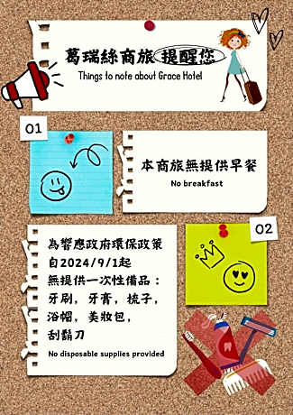 Grace Hotel Zhonghe provides flawless service and all the necessary facilities for visitors.Share your photos and respond to emails at your convenience, thanks to the free Wi-Fi internet access offered by hotel.Taxi offerings at the hotel enhance the ease of discovering Taipei. Visitors can take advantage of complimentary parking directly at the hotel. Reception services such as concierge service, express check-in or check-out, luggage storage and safety deposit boxes are available to accommodate your requirements.Should you desire access to the top entertainment in the city, assistance can be provided by the hotel's tours. Traveling with minimal baggage is achievable at Grace Hotel Zhonghe, as the hotel's laundromat and laundry service ensures your garments stay fresh. Room amenities feature daily housekeeping, allowing you to unwind and make the most of your visit. Minor items you neglected to bring won't cause major issues! Simply visit convenience stores to acquire what's necessary.The hotel maintains a completely smoke-free zone, providing a breathable atmosphere. Smoking is limited to specified smoking zones. Each accommodation at Grace Hotel Zhonghe is thoughtfully created and adorned to provide visitors with a comfortable, home-like atmosphere.In certain rooms, the hotel offers linen service, blackout curtains and air conditioning for guest convenience and satisfaction. In select rooms, guests at the hotel can enjoy top-notch in-room entertainment with television and cable TV available for their convenience.Rest assured, in a few chosen rooms, you will find the convenience of a refrigerator, a coffee or tea maker, bottled water, instant coffee, instant tea and mini bar at your disposal. Maintain your cleanliness and comfort using a hair dryer, toiletries and bathrobes available in select guest restrooms. Indulge in the numerous pursuits available at Grace Hotel Zhonghe.For individuals who don't want to skip their exercise routine, visiting the hotel fitness center ensures you maintain your vitality and wellness.