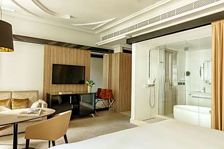 Palacio de los Duques Gran Meliá - The Leading Hotels of the World is located 984 feet from Madrid's Royal Palace, the Royal Theater and the Cathedral. It features a seasonal rooftop pool and a terrace with city views. Set on a 19th-century palace, Palacio de los Duques Gran Meliá - The Leading Hotels of the World is inspired by Velazquez's famous paintings and has its own private lush historic garden. There is also a Thai Room wellness center and a 24-hour gym. Rooms and suites at this hotel feature a 49-inch LED-TV with Chromecast, iPhone docking station, Nespresso coffee machine and free WiFi. The private bathroom includes a shower, heated floors and toiletries. Palacio de los Duques Gran Meliá - The Leading Hotels of the World offers 2 restaurants serving Spanish cuisine and wines. There is also a bar and a tea corner. Plaza Mayor is 1640 feet from Palacio de los Duques Gran Meliá - The Leading Hotels of the World, and Sabatini Gardens are 984 feet away. The Prado Museum is 20 minutes’ walk away.