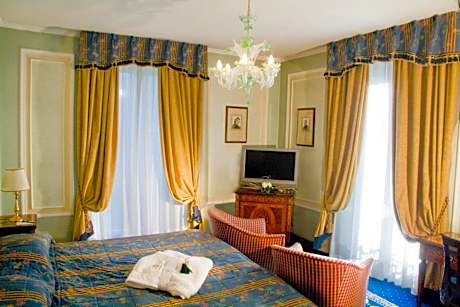 This majestic property in Art Nouveau style includes indoor and outdoor swimming pools and a spa. It is on the shores of Lake Maggiore in Stresa, across from the Borromean Islands. Grand Hotel des Iles Borromées & SPA offers elegant rooms with LCD TV and marble bathroom with spa bathtub. Some rooms have views of the grounds and the Alps, some overlook the lake and the islands. The Grand Hotel's spa center is complete with indoor swimming pool, hot tubs and saunas. Beauty treatments and massages are available. The restaurant serves regional cuisine, and guests can dine on the terrace in summer. The hotel also has a stylish piano bar. Breakfast is a generous buffet, served daily. The hotel is on the central Corso Umberto 1° promenade. Free parking is available on site.