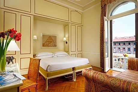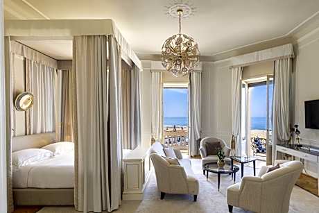 Located in front of the sea on Viareggio's promenade, the Grand Hotel offers 2 restaurants, a wellness center and a pool with a hydromassage on the rooftop terrace with views of the Versilia coast and the Apuan Alps. Accommodations is located on five floors. Most rooms and suites are with sea view. The Piccolo Principe restaurant is located in the veranda on the ground floor overlooking the sea promenade. The "La Terrazza Bistrot" restaurant is located on the rooftop terrace of the 5th floor. It serves local specialties, seafood, and pizza. The buffet breakfast is served at the hotel. The Thermarium is included in the stay and it offers Finnish spa, Turkish bath, Salidarium with lounge chairs and showers.