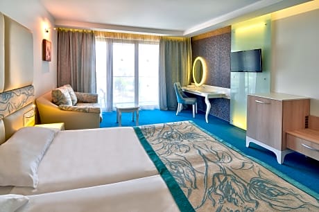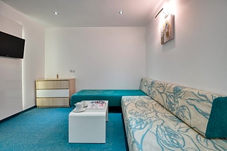 Right on the seaside promenade in Golden Sands, Grifid Metropol Hotel offers for free 2 sun beds and 1 umbrella per room at the private beach in front of the hotel and air-conditioned rooms with undisturbed sea views from the balcony. Refreshments and cocktails are served at the pool bar, beside the outdoor swimming pool. Free WiFi access is available in the rooms and lobby. All rooms are modernly furnished with spacious balconies, satellite TV, free of charge safe and mini bar. The Premium All inclusive offer at the Grifid Metropol Hotel combines wide selection of local and imported alcoholic drinks, refreshments and cocktails are served at the 4 bars, the Lobby-piano bar, the Pool bar, the Sky bar, and the Lounge bar at the beach. The hotel's main restaurant offers a-la-carte service. A Fusion and Italian restaurants and theme evenings (Bulgarian, Rodizio, Mongo) are also at guests' disposal. A "Dine Around" complimentary dinner choice of a la carte restaurants is offered, including variety of cuisine types. Fish restaurants in Bolero and Sky restaurant (1 dinner) and Classical Restaurant (Asian and french cuisine) in Vistamar. Prior reservation & minimum stay 4 nights are required for all restaurants in the “Dine Around” program. Fresh fruits are served once a day, in the afternoon, at the sun chairs. Breakfast is served and guests can choose from the a la carte menu, including hot dishes such as omelets, pancakes, eggs and includes drinks – fresh orange juice, smoothie, water, coffee and tea. During July and August, BBQ nights and beach parties are held. Guests can also benefit from an infinity effect pool and outdoor relax pool. Pool Bar offers smoothies and fresh juices at the bio pool, depending on the season. Massages, sauna, beauty salon and relax zone services are offered at a surcharge. The stylish piano bar provides entertainment and live music in the evenings, while the Sky bar features panoramic views and innovative molecular cocktails. Cabanas on the beach are subject to additional charge. The Grifid Metropol Hotel is within walking distance from the restaurants and the shops in the resort. Varna Airport is 19 mi away and transfer can be arranged at a surcharge. Private parking is possible on site at a surcharge.