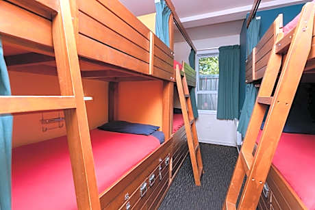 The dormitory rooms offer customized wood bunk beds with privacy curtains, a shelf with power points, and an under-bunk storage space. Toilet and bathroom facilities are shared.