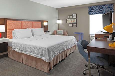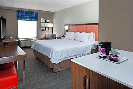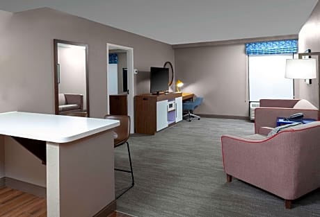Kitchen, sofa, lounge chair, desk, 32-inch TV, free WiFi Relax in this two-room king suite with a clean and fresh Hampton bed® and a kitchen. Sink into the sofa, recliner or lounge chair and watch movies on the 32-inch HDTV. Catch up with work at the desk with ergonomic chair. Surf the web with free WiFi. Refresh your senses in the bathroom, complete with a shower and plush towels. Enjoy the convenience of having a coffeemaker in the room.